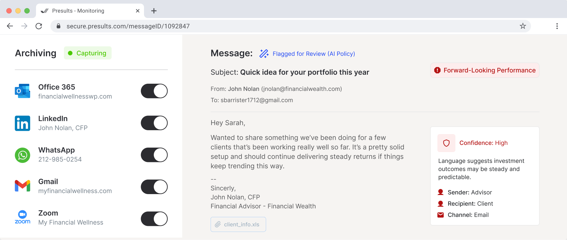 Real-time compliance reviews and self-regulation modules for modern financial advisory firms.